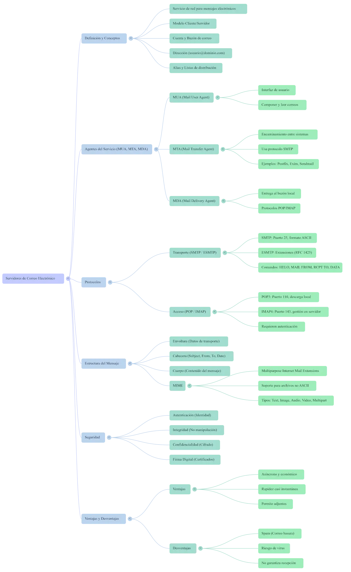 Este mapa mental muestra de forma visual y estructurada el recorrido completo de un correo electrónico, incluyendo los agentes que intervienen, los protocolos utilizados, la estructura del mensaje y los aspectos básicos de seguridad. Es ideal para repasar el proceso completo de un vistazo y afianzar conceptos clave de cara al estudio.